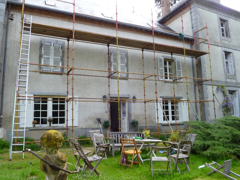 With work to replace rotten wood under the roof tiles, scaffolding was required at the chateau where i'm working. But luckily the scaffolding has come in very handy to strip down the old shutters and re paint (in between the rain however) as working up a ladder wasn't an option. Not long to go now until the main front windowns will be done, then when work on the back roof is to be done, i'll be able to strip the back shutters too. It's all coming together now, and the clients is really pleased.