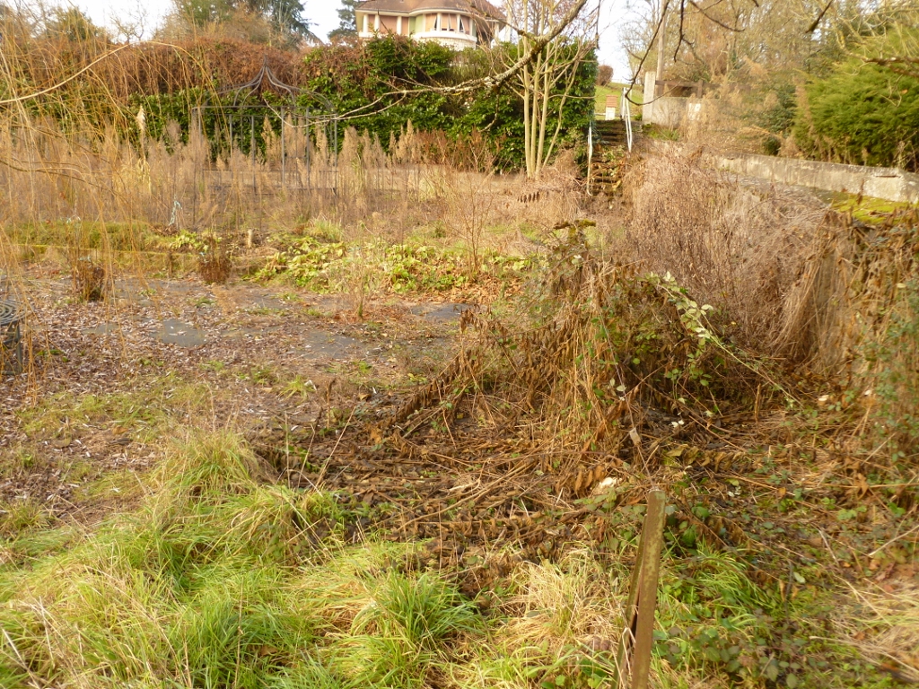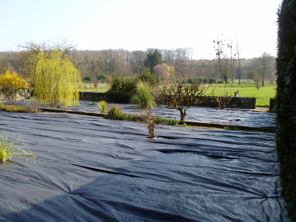 Our newest job is a garden renovation on a property which is near to Montmoriilon. The garden is 25 x 30 sq mtrs with 3 walls, and a Leylandii hedge to the 4th side. Although weed supressent had been laid, nothing had been placed ontop of this, so the weeds began over time to reappear.