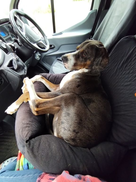 When I first joined they had an old van which had done a lot of miles, so they have invested in a different one. I enjoyed being out and about in the old one, but the new van being bigger and newer made me a little nervous. But the JONES's have been kind in purchasing a more secure seat for me which is very comfortable indeed (photo attached).
